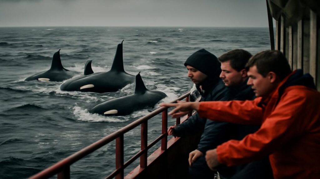 The crew of the small commercial cargo ship rushed to the stern. At first, there was only churning foam and the white comb of wake. Then a slick black fin cut the surface, tall as a man, slicing through the water with a kind of easy, muscular certainty. An orca. Then another. Then three more.